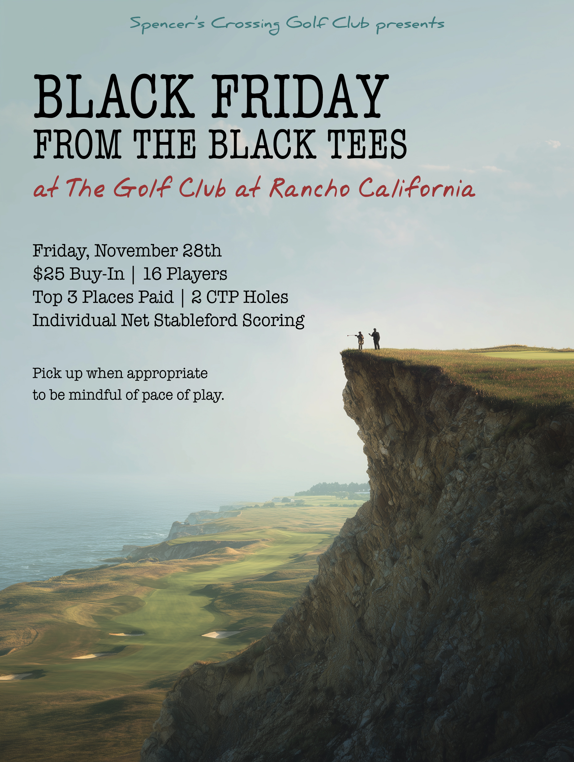 November 2025 Black Friday from the Black Tees Course The Golf Club at Rancho California | Murrieta, CA Format Individual Net Stableford Winners Ryan C - 1st (45 Stableford) Justin D - 2nd (36 Stableford) Segio A - 3rd (34 Stableford) Sergio A - CTP on #6 Bree M - CTP on #16 |